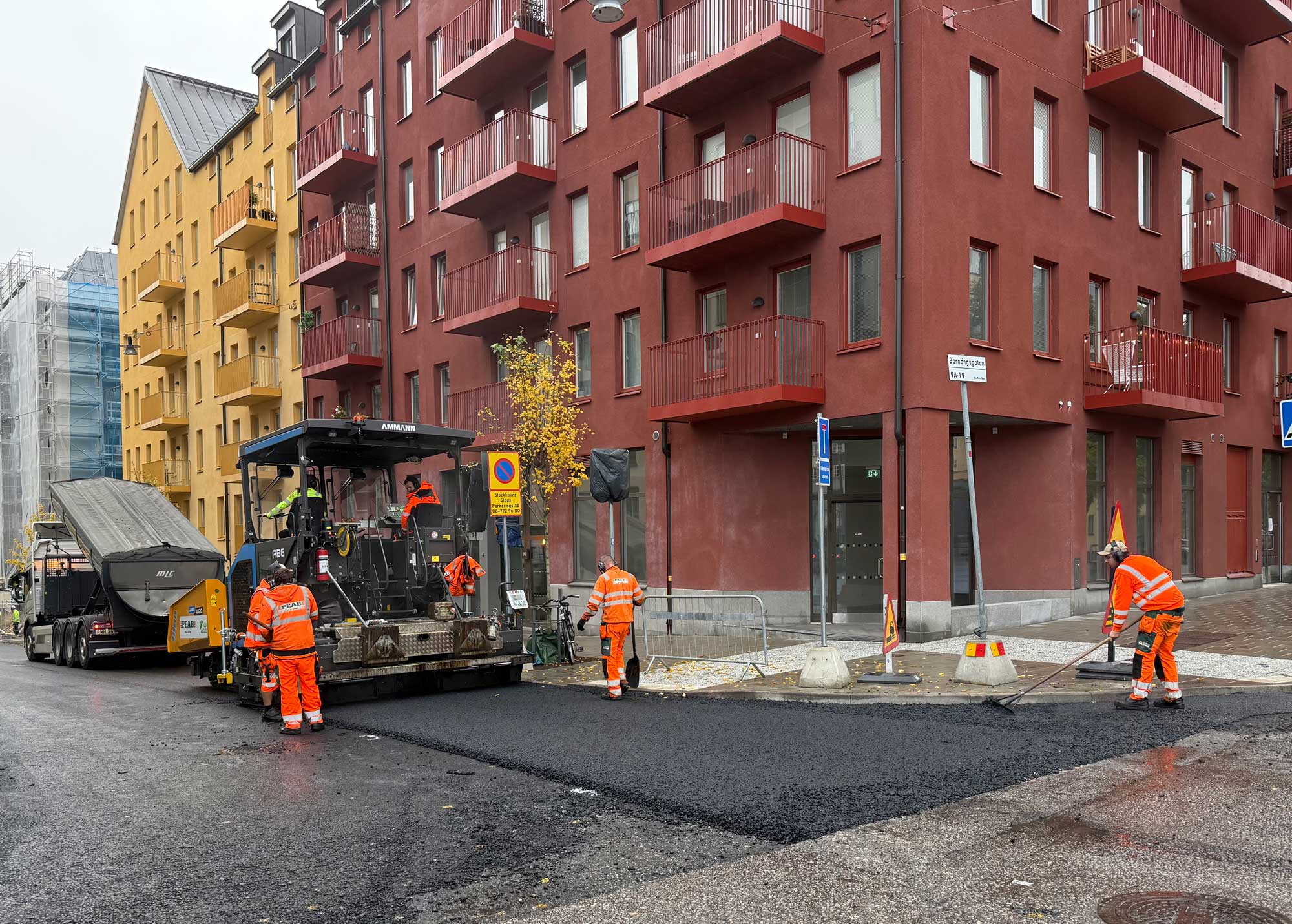 Det är oktobermorgon i bostadskvarteret Persikan på Södermalm i Stockholm och Peab Asfalt har startat arbetet med att asfaltera två gator. Det speciella är att asfalten här läggs med nya helt eldrivna och fossilfria maskiner.