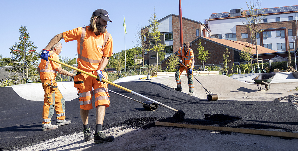 - Vi har lagt ut asfalten med hjälp av en kranbil för att enkelt kunna nå hela kickbikebanan. För oss är det en speciell typ av handläggning där man på grund av kuperingen måste använda handvältar. Vårt lag har tidigare lagt beläggning både på andra kickbike-banor och pumptrucks, så det är ett erfaret team, säger Jimmy Åberg, arbetsledare.