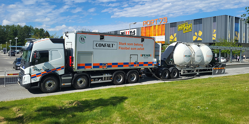 Peab Asfalt har fått en ny pumpbil som underlättar arbetet med att lägga ut Confalt®. Bilen är smidigare att köra och materialet blandas direkt ute på arbetsplatsen. - Det är en helt unik pumpbil som vi skräddarsytt för just vår verksamhet och det är dessutom den enda på marknaden som är en el-hybrid, säger Ola Nilsson, platschef på Peab Asfalt.
