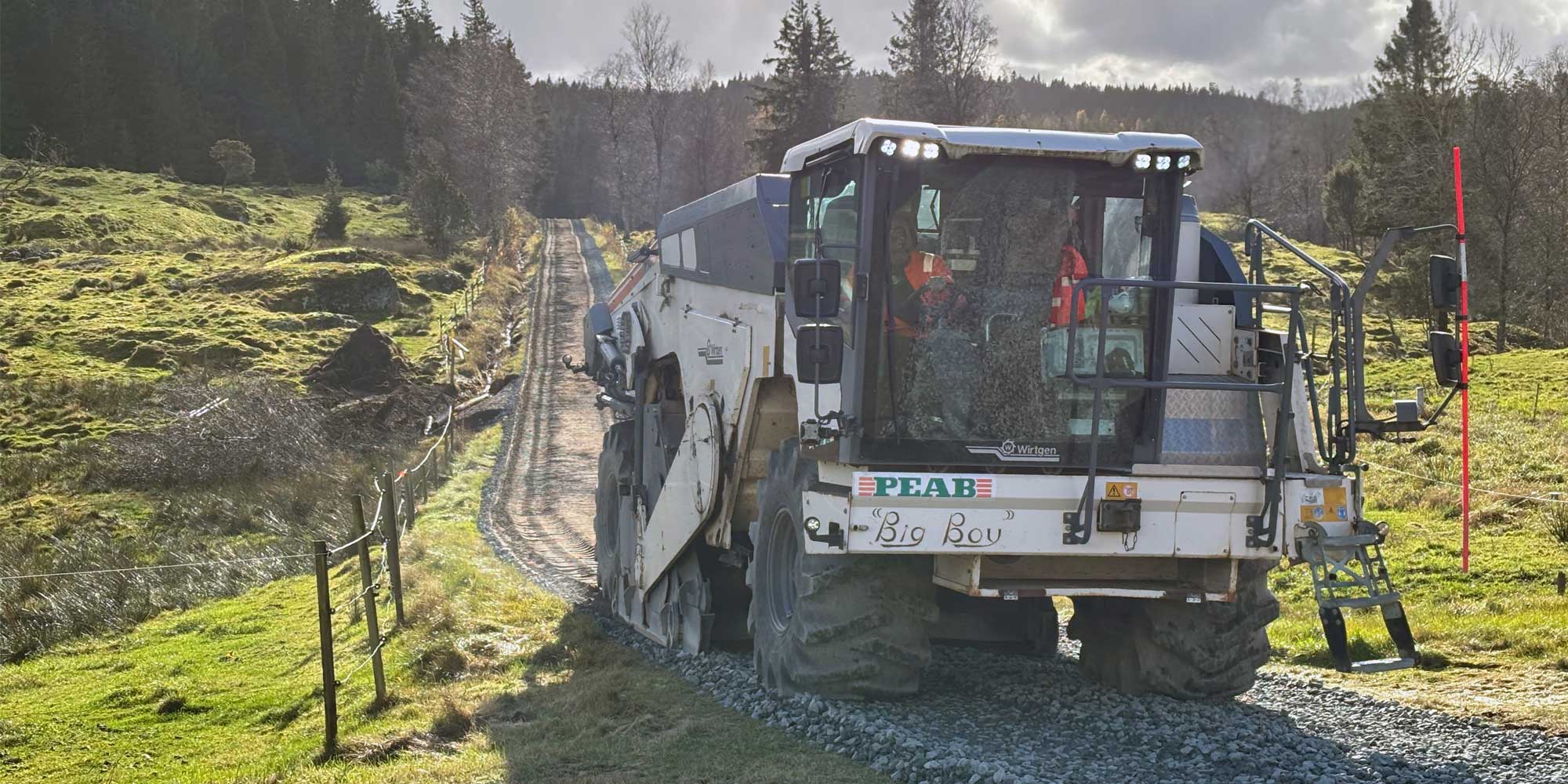 I halländska Gudmundared slingrar sig en åtta kilometer lång väg. När den asfalterade sträckan inte längre höll för timmertrafiken ville Holms vägförening ha en bättre lösning med grus. Peab fick uppdraget – och satte in en riktig tungviktare: djupfräsen.